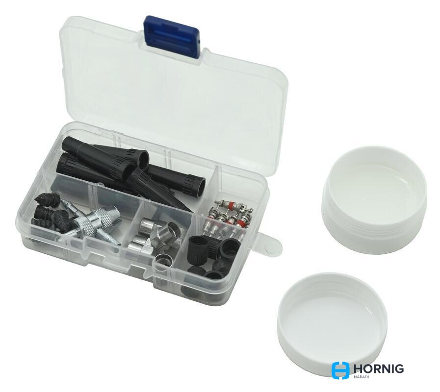 - Kompletní sada na ventilky: výměnné ventilky, klíč, vložky, kovové a plastové čepičky i prodlužovací nástavce.