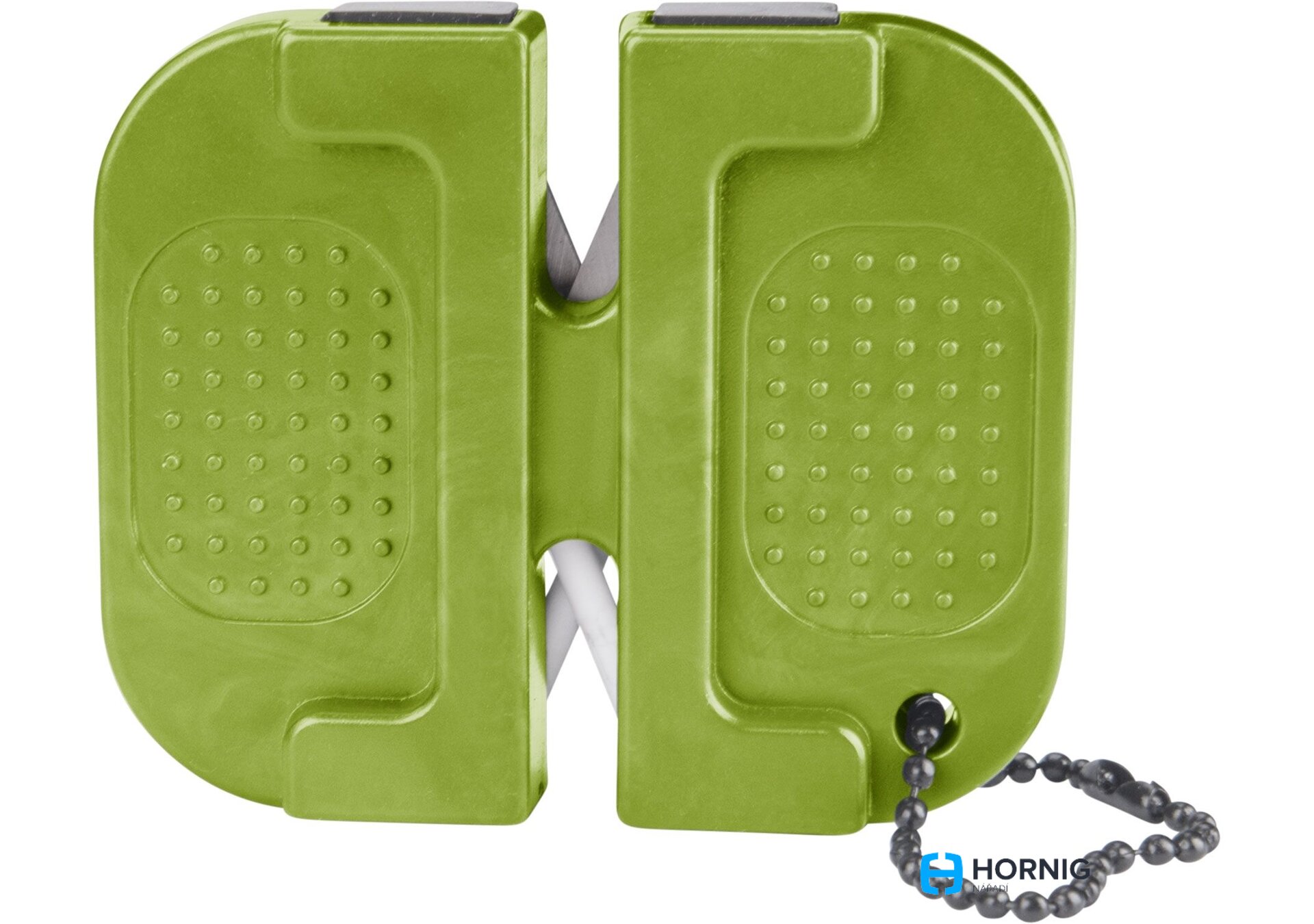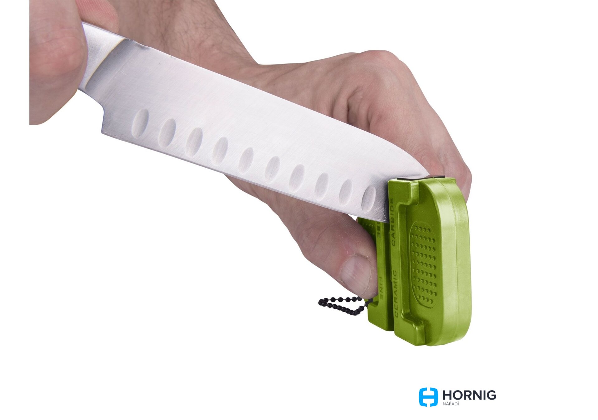 Malý outdoorový ostrič na nože s retiazkou, na brúsenie "nahrubo" pomocou dvojice karbidových listov a jemné finálne naostrenie pomocov keramických listov.