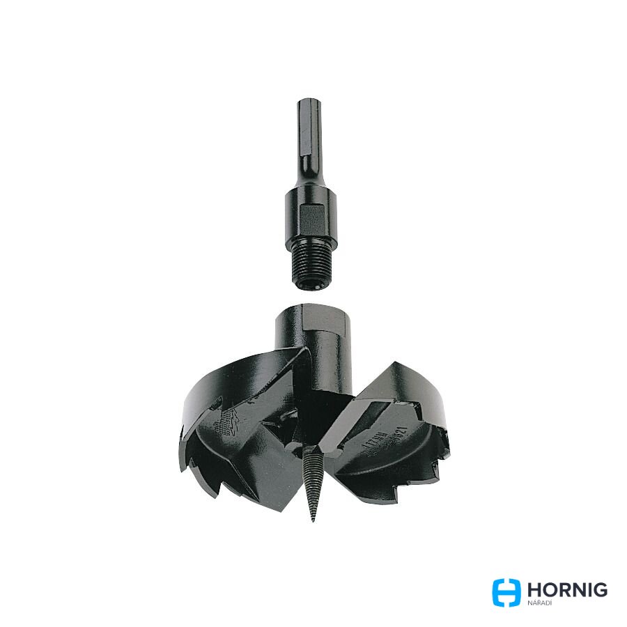 - Velké samořezné vrtáky mají dvojité vnitřní řezné plátky, které upilují poloměr otvoru a zaručují čisté, hladké otvory bez přítlaku.